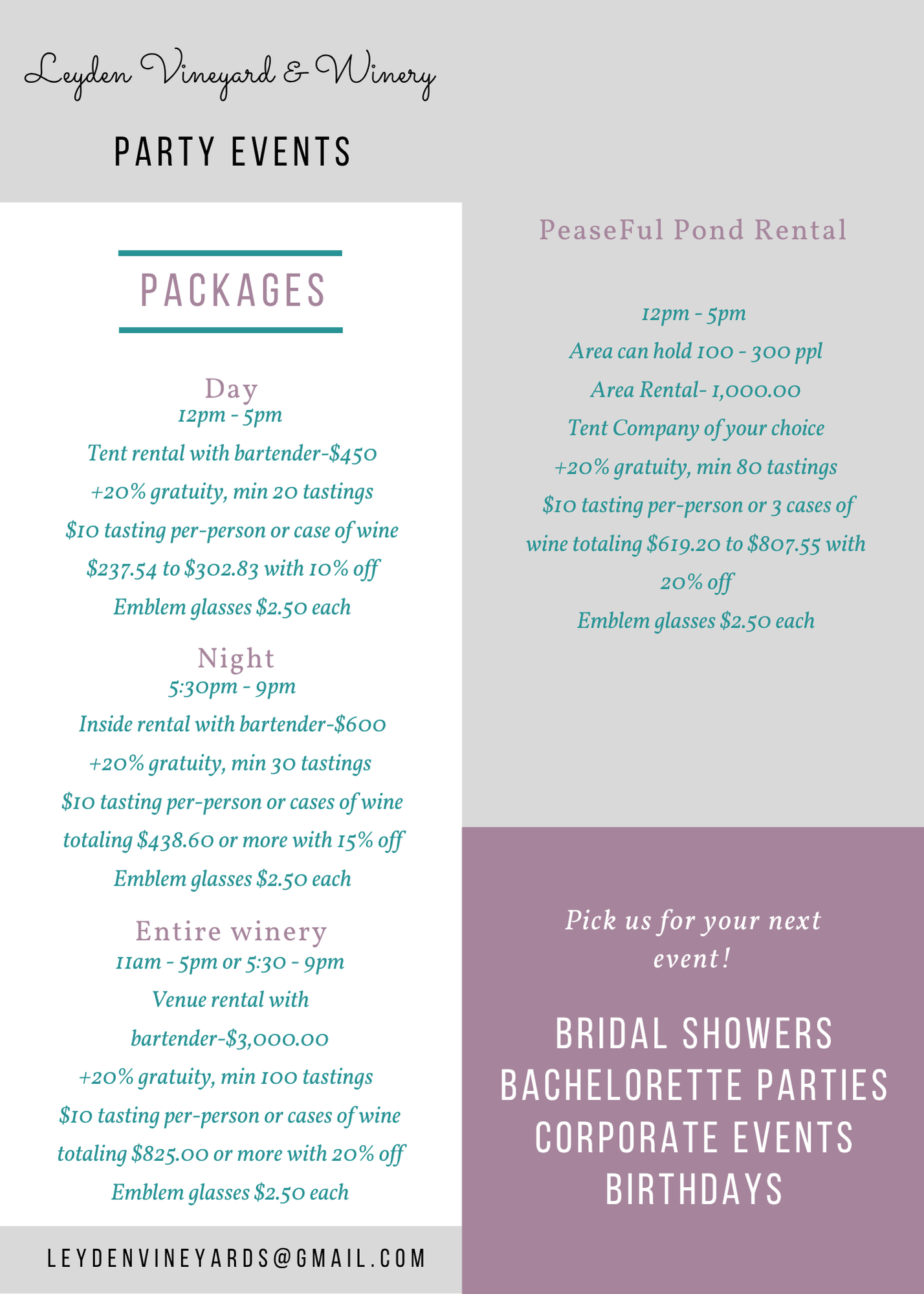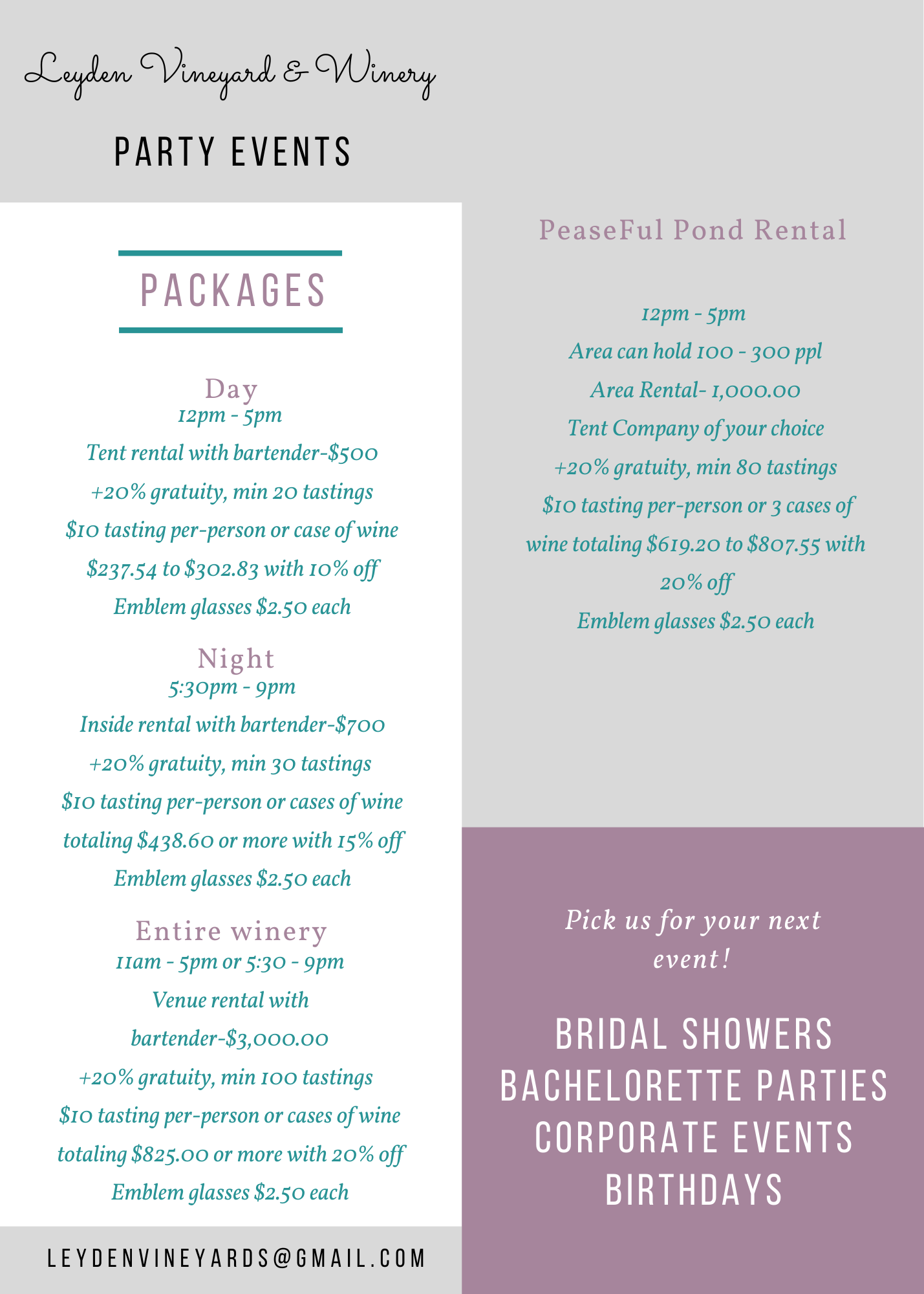 Birthdays - Bachelorettes - Corporate events